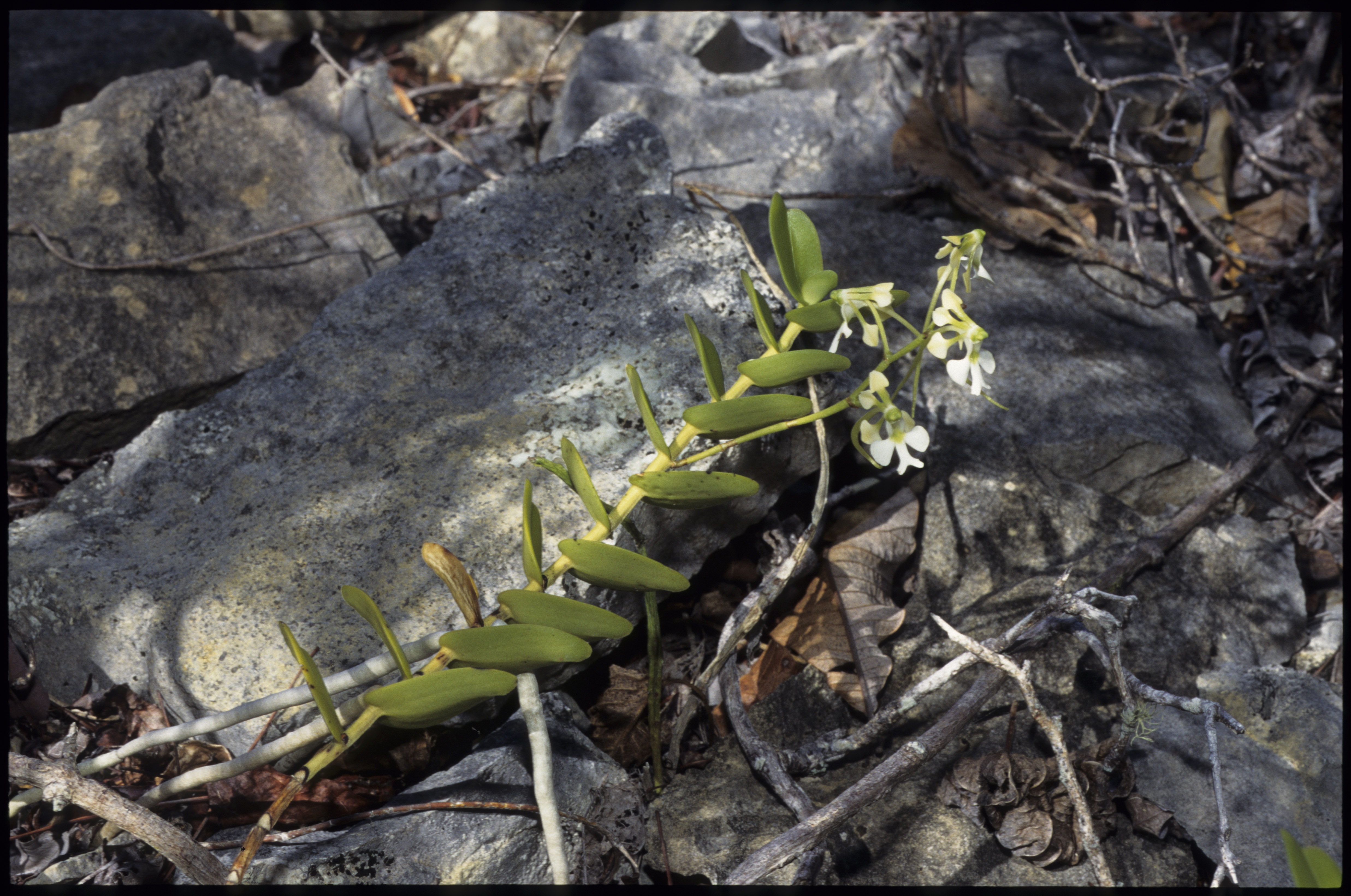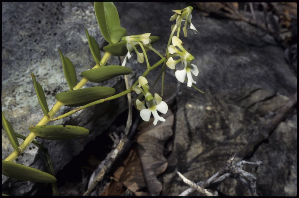 Found in northwestern Madgascar in deciduous forests on calcareous rocks at elevations of sea level to 350 meters as a miniature to small sized, hot growing lithophyte with a leafy stem carrying many, elliptic, leaves that blooms in the late spring and early summer on an axillary, 1 to 3.2" [2.5 to 8 cm] long, 1 to 7 flowered inflorescence.