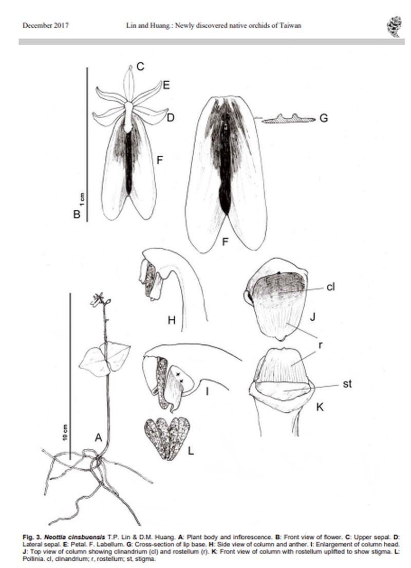 "This species was identified as Listera nankomontana Fukuyama (now Neottia nankomontana (Fukuy.) Szlach.) by Chung (2008: 86). However, N. nankomontana has a pointed, not rounded, labellum, which can clearly be seen in the type specimen, Fukuyama 4139 in KPM-NA0105561 (Fukuyama, 1935, also see fig. 4b in Lin, 2015). The pointed tips of the lobules of N. nankomontana are in agreement with Fukuyama’s original description as “apice acutis”. The misidentification could also be because N. cinsbuensis is also found at Kirittoi at 2550 m (photo provided by Mr. Sheng-Kun Yu, not shown). A location between Kirittoi (2570 m) and Bunakkei (3500 m) at Nanhutashan is the type locality of Listera nankomontana (Fukuyama, 1935). Flower qualities of N. cinsbuensis are similar to those of other species of Neottia in Taiwan, but the margin of the lip has no layer of specialized cells which reflect light in the daytime, thus forming a white outline." Tsan-Piao LIN and Da-Ming HUANG 2017
