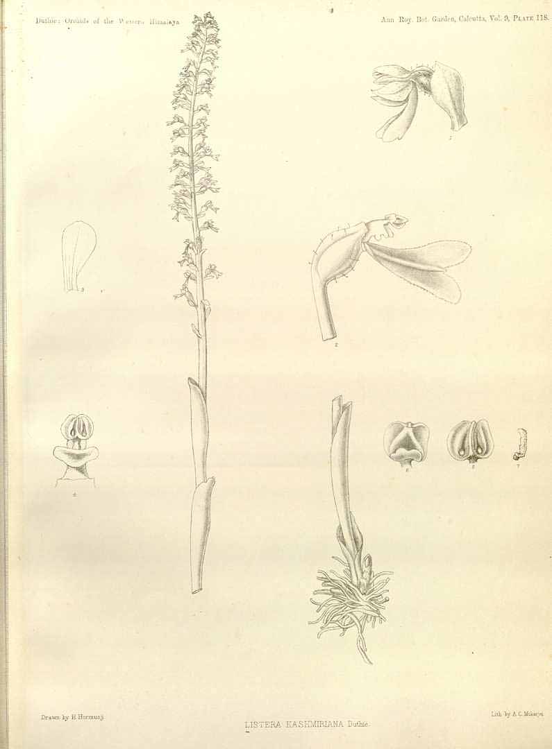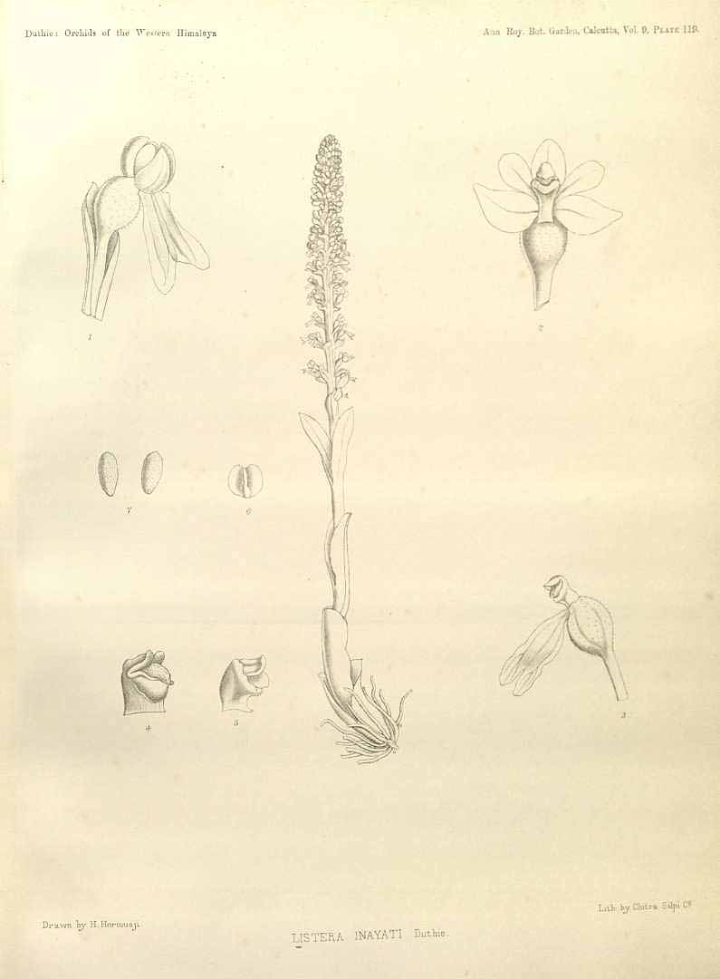 References W3 Tropicos, Kew Monocot list , IPNI ; *Orchids of the North-Western Himalaya Duthie 1906 as Listera inayatii drawing fide; Orchids of the North-Western Himalaya Duthie 1906 as Listera kashmiriana drawing fide; Indian Orchids, Guide to Identification and Culture Pradhan 1976 drawing fide; Indian Orchids, Guide to Identification and Culture Pradhan 1976 as Listera khashmiriana drawing fide; LANKESTERIANA 15(1): 7—50. Jeewan Singh Jalal & J. Jayanthi 2015
