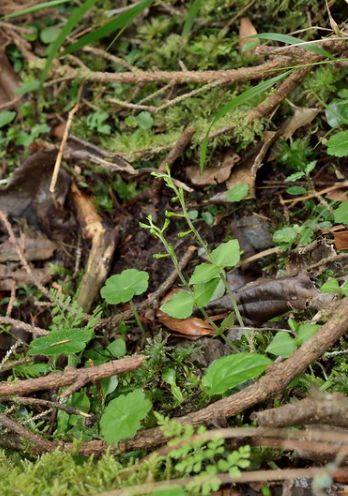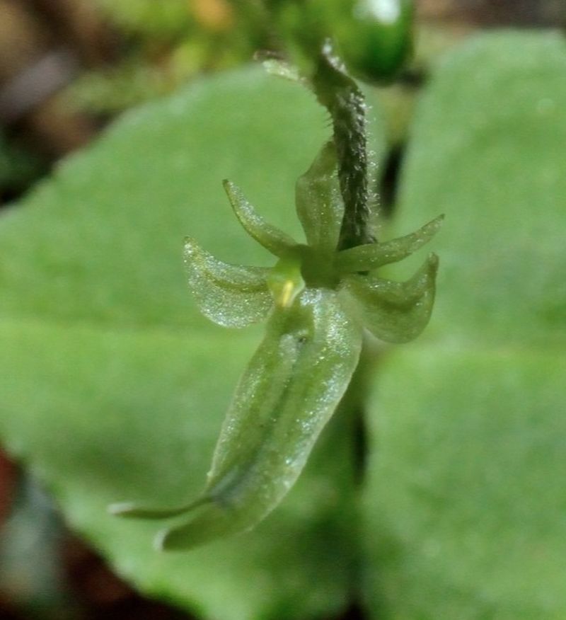Found in south central Taiwan in forests at elevations of 2600 to 2700 meters as a miniature sized, cold growing terrestrial with a rhizome giving rise to an erect, slender stem carrying 2, opposite, at the middle of the stem, deltoid to ovate suborbicular, membraneous, acute, broadly truncate below into the subsessile base leaves that blooms in the later summer on an erect, terminal, peduncle pubescent, provided with 2 sterile bracts, rachis 1.2 to 1.6" [3 to 4 cm] long, pubescent, laxly 3 to 7 flowered inflorescence with ovate-lanceolate, acute, less than half as long as the ovary floral bracts