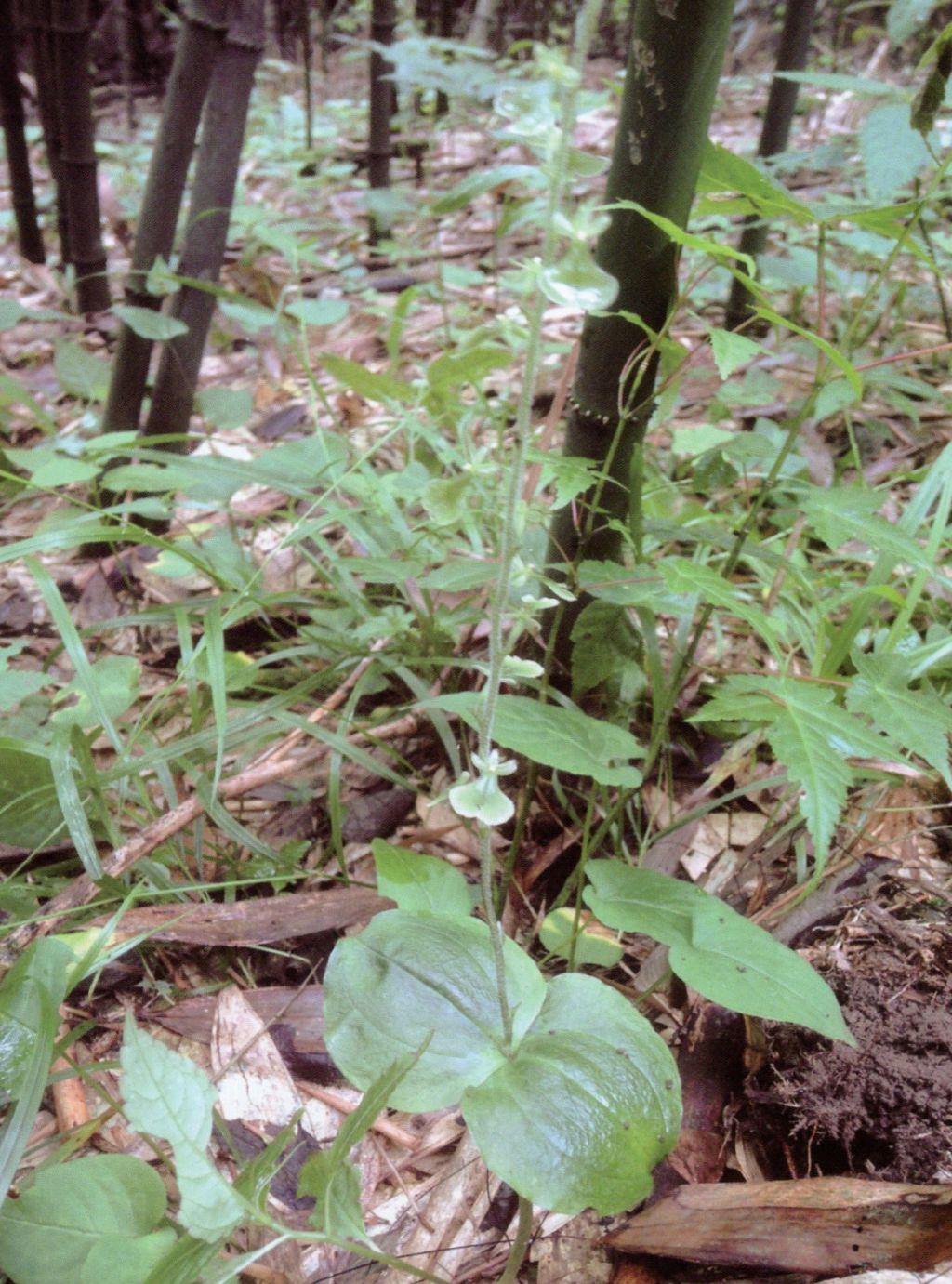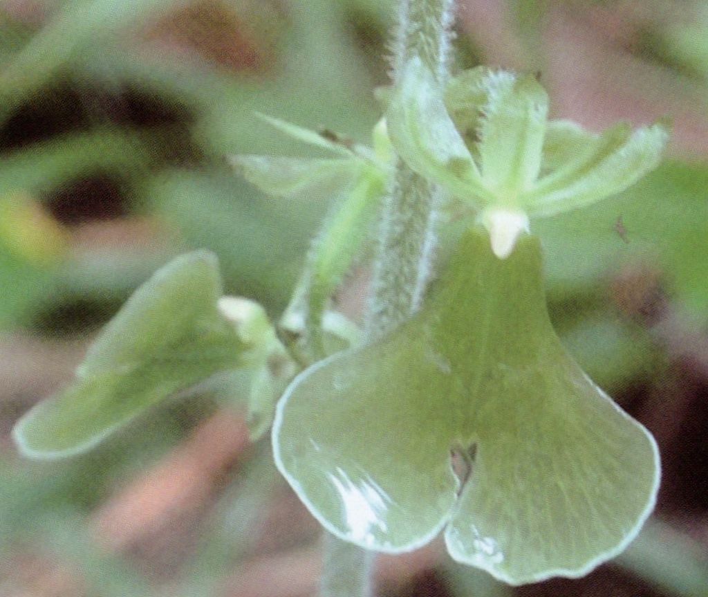 Found in Chongqing province of China at forest margins at elevations of 2000 to 2100 meters as a small sized, cold growing terrestrial with a slender stem with 1 to 2 sheaths near the base and carrying 2, opposite, below the middle of the stem, subsessile, broadly ovate to broadly ovate-cordate, obtuse to acute, broadly cuneate to nearly shallowly cordate into the base leaves that blooms in the summer on a terminal, erect, pubescent, 2.4 to 4" [6 to 10 cm] long, laxly 10 to 19 flowered inflorescence with ovate-lanceolate, acuminate floral bracts.