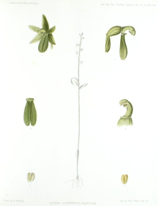 References W3 Tropicos, Kew Monocot list , IPNI ; The Orchids of Sikkim-Himalaya Part 1 King & Pantling 1898 Listera alternifolia drawing fide; Indian Orchids, Guide to Identification and Culture Pradhan 1976 as Listera alternifolia drawing fide; Orchids of Bhutan Pearce & Crib 2002 as Listera alternifolia; Orchids of India A Glimpse Misra 2007 as Listera alternifolia; A Century of New Orchid Records in Bhutan Royal Government of Bhutan 2017 drawing fide/photo good?