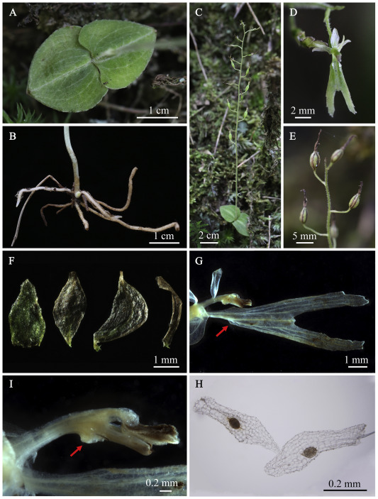 A) Leaves; (B) Roots; (C) Habit; (D) Flower; (E) Mature fruits; (F) Bract, dorsal sepal, lateral sepal, petal; (G) Lip, claw with a pair of auricles (indicated by arrow); (H) Gynostemium, enlarged at apex (indicated by arrow); (I) Seeds.