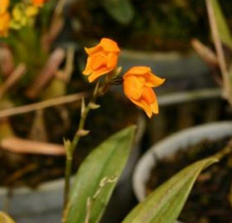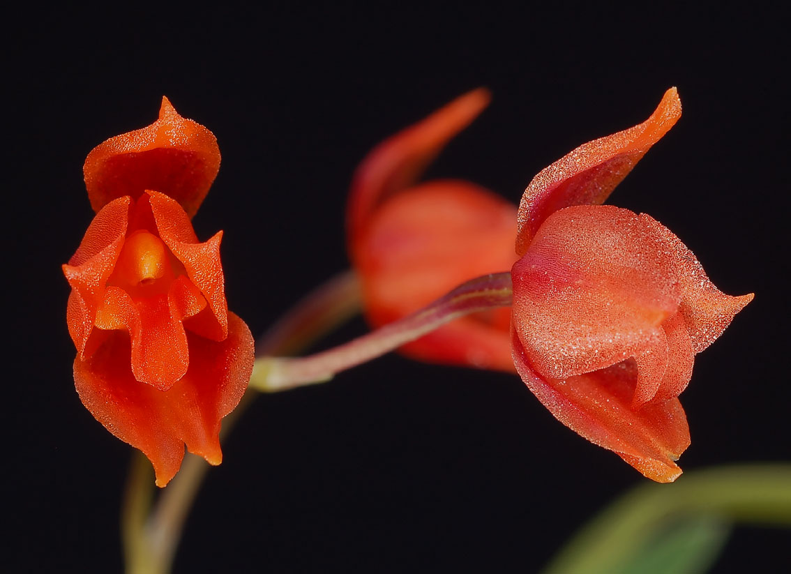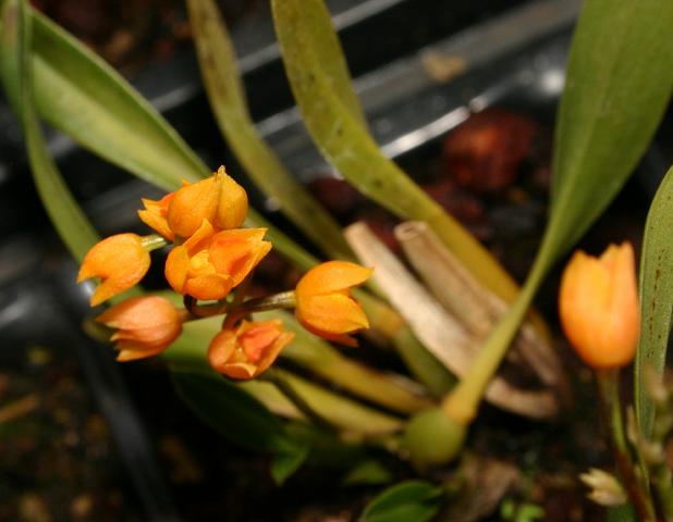 Found in Peru and Bolivia in wet montane forests at elevations around 2650 meters as a small sized, cold growing epiphyte with oblong-ovoid, compressed pseudobulbs subtended by 1 to 2 foliaceous bracts with a single, apical, lanceolate, conduplicate towards the base leaf that blooms in the fall and spring on a erect, pedunculate raceme or a short branched panicle, 4 3/8" [11 cm] long, few to several [5 to 7] flowered inflorescence with infundibuliform, acuminate floral bracts arising on a newly matured pseudobulb with campanulate flowers.