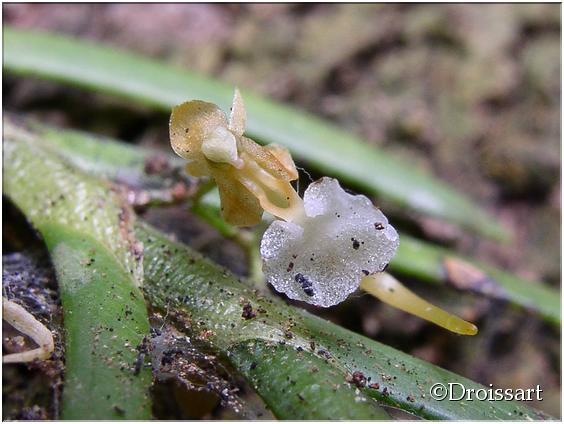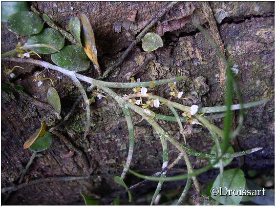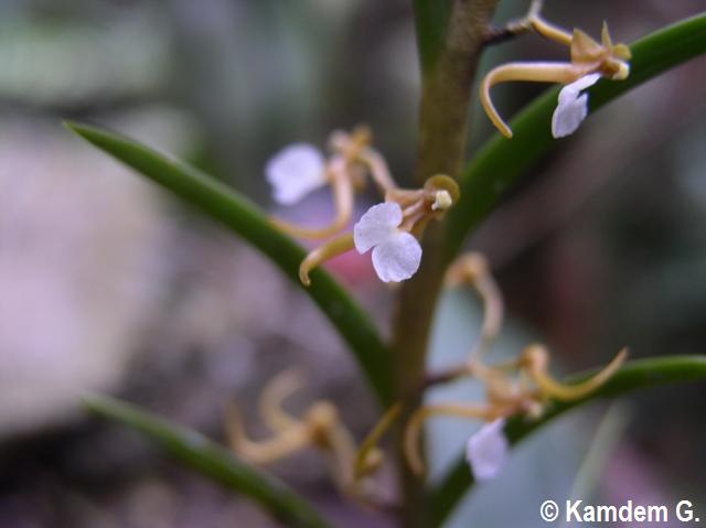Found in Gabon in woodland trees on branches at elevations of 1500 meters as a small to medium sized, cool growing epiphyte with pendulous, elongate, slender stems sometimes branching and carrying in the apical part, widely spaced, terete but flattened, often curved, acute leaves that blooms in the fall on an opposite the leaves, .4" [1 cm] long, 1 to 4 flowered inflorescence