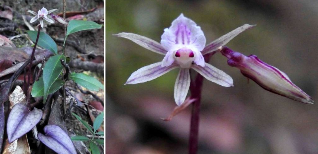 Found in southern Vietnam in Evergreen broad-leaved humid forests on granite at elevations of 1000 to 1200 meters as a mini-miniature to miniature sized, cool growing terresrial with a short creeping rhizome-like, flexuous stem, composed with several cylindrical or fusiform, oblique, dull violet to pale brownish-violet, fleshy, smooth, ascending pseudobulbs sympodially arising from the oblique apical part of each other, and carryiing a single, apical, sessile, joined to apex of petiole-like apical part of pseudobulb, which is terete, fleshy, erect to oblique, narrowly cordate, somewhat fleshy, pale gray-violet, mottled with darker, unclear, dull violet spots, with prominent median vein, acute, straight along the margin leaf that blooms in the later summer on an erect, arising from pseudobulb apex, sheathed at the base, erect slender peduncle thin, glabrous, 2 to 4" [5 to 10 cm] long, dull purple-violet to pale purple-brownish, provided with 1 to 4 persistent, membranous, well distant, narrowly triangular, acute, sterile bracts; rachis (0.8)1–4(4.5) cm long, straight, purple-violet, spirally arranged, lax, 1 to 5 flowered inflorescence with horizontally directed, yellowish membranous to papyraceous, narrowly triangular acuminate, longer than the ovary floral bracts.