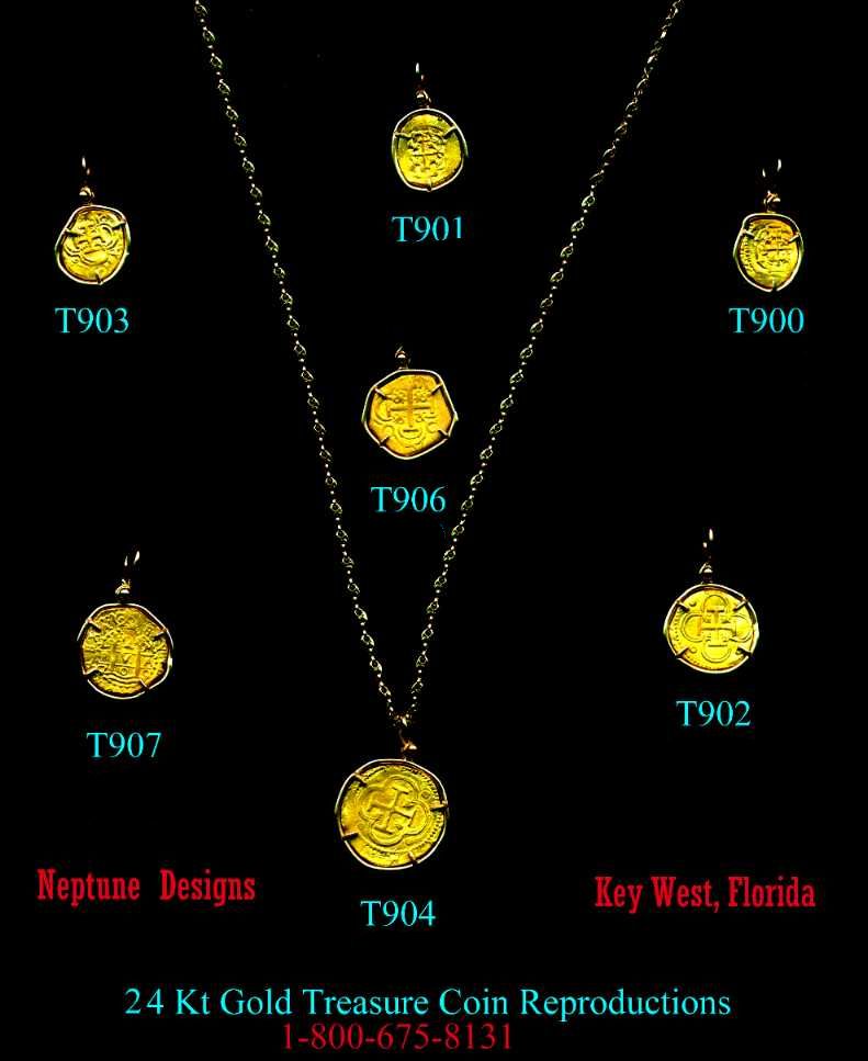 Gold Mounted Treasure Coins 24 karat solid gold coins mounted in 14 karat gold settings, all coins are reproductions of 1622 thru 1715 Spanish new world gold, meticulously crafted to make a quality piece of fine jewelry.