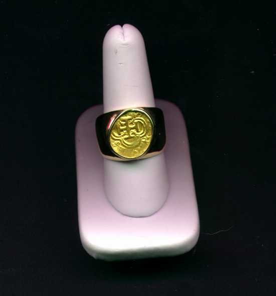 24K Treasure Coin Ring 24 karat solid gold. 1715 plate fleet coin reproduction set in a solid 14 karat gold ring mount.