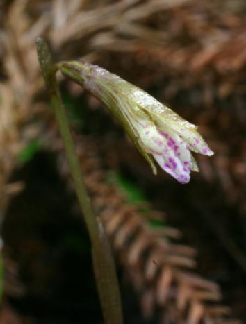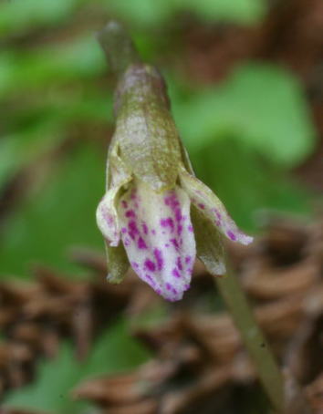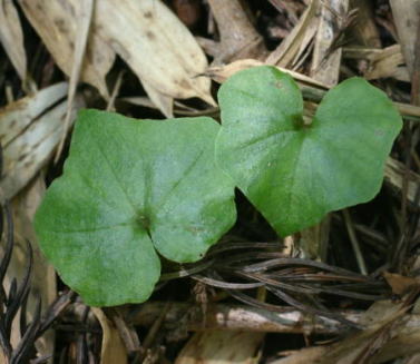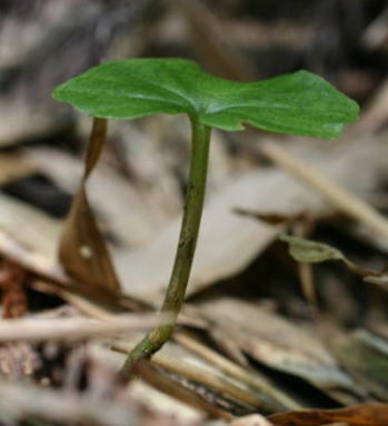 Found Japan, Ryukyu Islands and Taiwan in shady areas of primary, broad-leafed, and semi-deciduous, mixed and coniferous forests on rocky limestone at elevations of 1300 to 1400 meters as a miniature sized, cold growing terrestrial that has a single, cordate, 3 lobed, obtuse leaf that blooms after leaf fall on an erect, 6" [15 cm] long, single flowered inflorescence with a nodding flower.