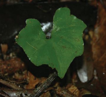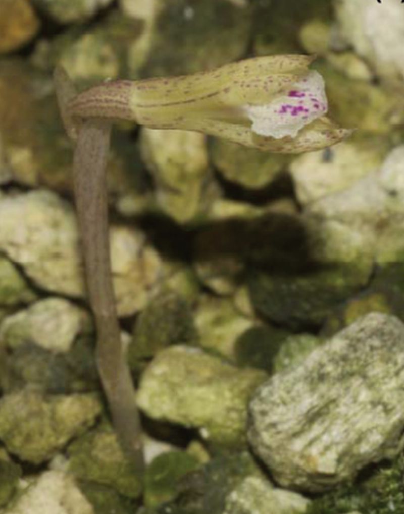 Found in Hainan province of China and Taiwan in broad leaves forests at elevations around 600 meters as a mini-miniature sized, warm growing terrestrial with a whitish to beige, subglobose to ovoid, 2 to 3 noded tuber giving rise to an erect stem carrying a single dark green, polygonal-cordate, membraneous, glabrous, 5 to 7 main veined, veins slightly raised on abaxial surface, cordate toothed at the tips of the veins, acute, deeply cordate below into the petiolate, light green tinged purple base leaf that blooms in the late winter and early spring on an erect, peduncle pale purple to beige-brown with purple flecks, provided with 1 to 2 tubular sheaths, 1.36 to 2.16" [3.4 to 5.2 cm] long, single flowered inflorescence with erect, ligulate when flattened, acute, margin minutely denticulate towards the apex, shorter than the ovary floral bracts and carrying nodding resupinate, weakly opening if at all flowers.