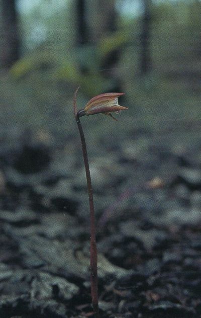 Found in Tanzania, Malawi, Mozambique, Zambia and Zimbabwe in grasslands and grassland scrub at elevations around 600 to 1500 meters as a miniature to small sized, warm to cool growing mycoheterotrophic terrestrial with a sunspherical to ovoid tuber giving rise to a single, arising after flowering, erect, ovate, acute, glabrous, heavily pleated, dark olive green above with silvery lines, dark purple beneath, petiolate base leaf that blooms in the spring and summer on an erect, to 12" [30 cm] long, 1 to occasionally 2 flowered inflorescence with 1 to 2 long bracts and carrying a suberect to nodding, gree to yellow green more or less purple suffused and a white to greenish white lip veined with purple.