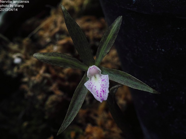 Found in Lan Yu Taiwan in evergreen forests at elevations under 400 meters as a miniature sized, hot growing terrestrial with a whitish, subglobose to ovoid tuber giving rise to an erect stem carrying a single abaxially pale green, adaxially green, 5 to 6 sided to cordate, membraneous, glabrous, 5 to 7 main veined, margin crisped, acute, cordate below into the petiolate base leaf that blooms in the late winter and early spring on an erect, peduncle brownish beige, provided with 1 to 2 tubular sheaths, 3.2 to 6" [8 to 15 cm] long, single flowered inflorescence with lanceolate to linear-lanceolate, acute, shorter to the same size as the ovary floral bracts and carrying nodding resupinate flowers.