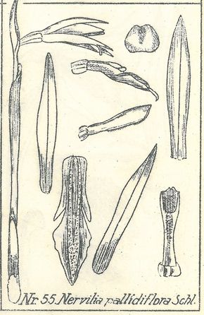 Nervilia pallidiflora Schltr. 1911 SECTION Linervia Type Drawing by © Schlechter and The Swiss Orchid Foundation at the Jany Renz Herbaria Website