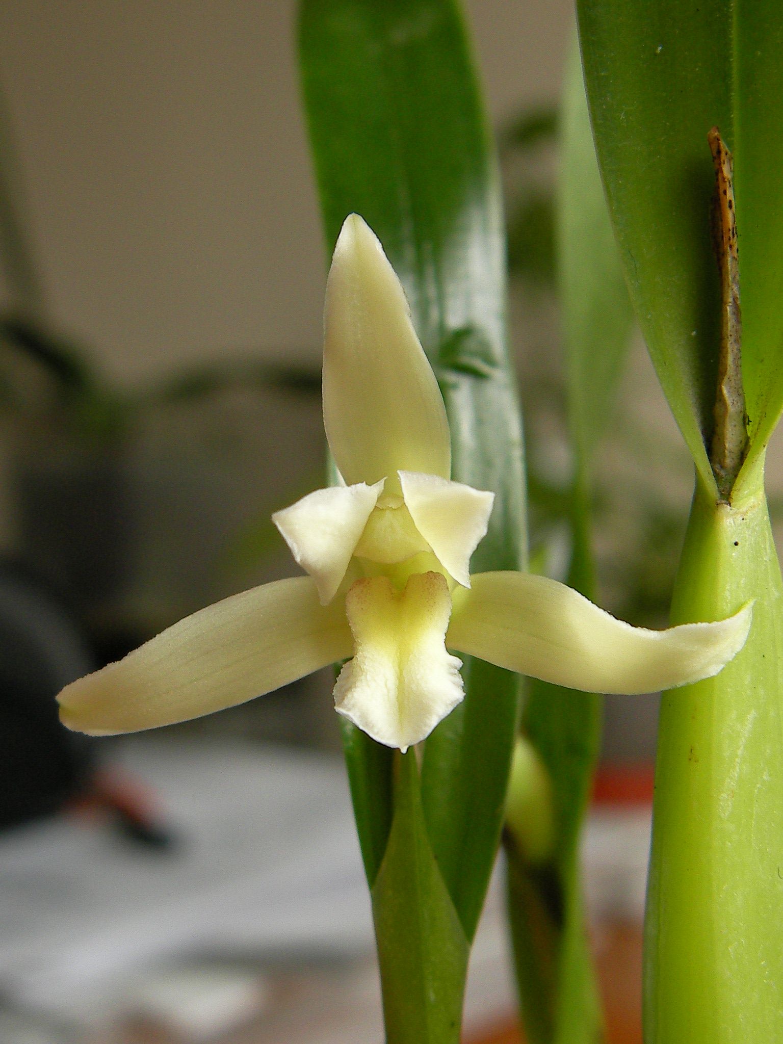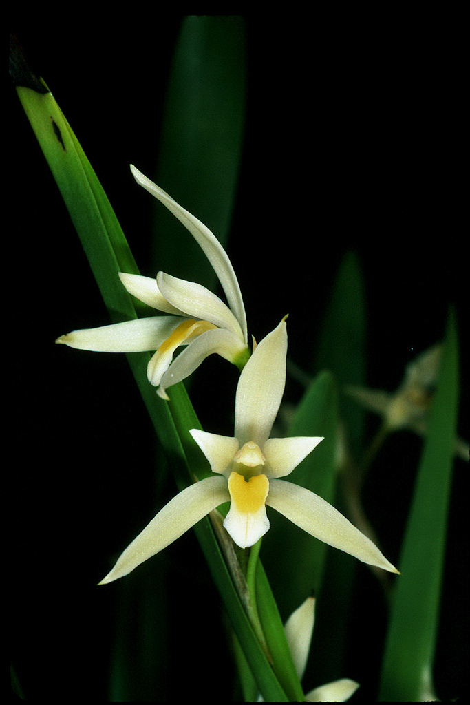 A small sized, epiphytic, hot to cool growing orchid found in Mexico to Panama as well as Cuba and Surinam in treetops of wet tropical forests from sealevel to 1500 meters with clavate or fusiform, slightly compressed pseudobulbs partially enveloped basally by a few scarious leafless sheaths and carrying 1 or rarely 2 apical, linear, obtuse, shiny dark green, basally conduplicate leaves that blooms with fragrant flowers in the spring on an erect, to 6" [15 cm] long, laxly few flowered inflorescence with scarious brown bracts arising from the apex of a newly emerging pseudobulb.