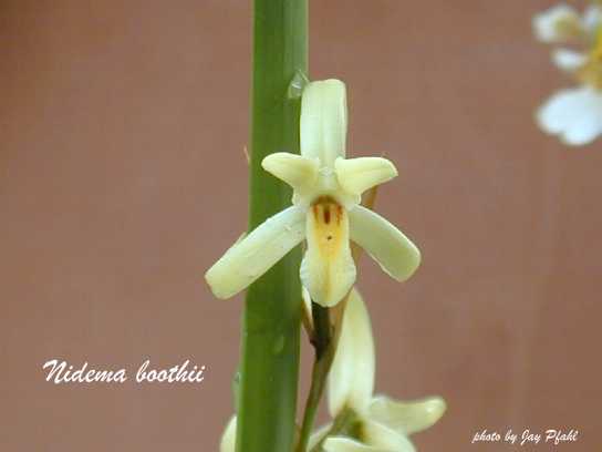 References W3 Tropicos, Kew Monocot list , IPNI ; Bonplandia Rchb.f 1856 as Epidendrum auritum; Refugium Botanicum Reichenbach 1869 as Epidendrum paleaceum drawing fide; Symbolae Antillanae Vol VI Orchidaceae Urban 1909 as Epidendrum paleaceum; Repert. Sp. Nov. Regni. Veg. Beih. 17: 43. Panama Schlechter 1922 as N boothii var triandrum; Repert. Sp. Nov. Regni. Veg. Beih. 19: 45. Costa Rica Schlechter 1923; Repert. Sp. Nov. Regni. Veg. Beih. 19: 130. Costa Rica Schlechter 1923; Repert. Sp. Nov. Regni. Veg. Beih. 19: 220. Costa Rica Schlechter 1923; The Genus Epidendrum Ames 1936 as Epidendrum paleaceum; The Orchids of Panama L.O. Williams & P Allen 1946 as Epidendrum boothii; Ceiba Vol 5 No 1 L O Williams 1956 as Epidendrum boothii; AOS Bulletin Vol 30 No 9 1961 as Epidendrum auritum; AOS Bulletin Vol 31 No 3 1962 as Epidendrum boothii; Encyclopedia of Cultivated Orchids Hawkes 1965 as Epidendrum boothii; Flora de Venezuela Foldats Volumen XV Part 3 1970 as Epidendrum boothii; Las Orquedias De El Salvador Vol 1 Hamer 1974 as Epidendrum boothii drawing/photo fide; AOS Bulletin Vol 48 No 5 1979; Orquídea (Mexico City), n.s., 7[3]: 1979; Las Orquedias de El Salvador Vol 3 Hamer 1981 as Epidendrum boothii drawing fide; Icones Planetarum Tropicarum plate 884 Dodson 1983 drawing fide; An Introdution to the Orchids of Mexico Wiard 1987 photo fide; Orchids Travel By Air A Pictoral Safari Mulder, Mulder-Roelfsema and Schuiteman 1990 photo fide; The Manual Of Cultivated Orchid Species Bechtel, Cribb & Launert 1992 photo fide; Guatemala Y Sus Orquideas Behar & Tinschert 1998 photo fide; Harvard Pap. Bot. 5 #2: Carnevali etal. 2001; Manual de Plantas de Costa Rica Vol 3 Hammel, Grayum, Herrera and Zamora 2003 drawing fide; AOS Bulletin Vol 76 No 3 2007 photo fide; AOS Bulletin Vol 79 #1 2010 photo fide; Guia de Orquideas de Chiapas Carlos Rommel Beutelspacher Baigts 2013 photo fide; Orchid Genera and Species in Guatemala Archila, Szlachchetko, Chiron, Lipinska, Mystkowska and Bertolini 2018 photo fide; Vanishing Beauty, Native Costa Rican Orchids Vol 2 Lacaena to Pteroglossa Pupulin 2020 photo fide