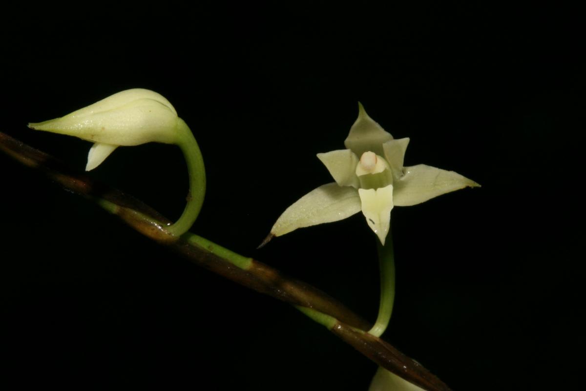Found from Bahamas, Cuba, Dominican Republic, Haiti, Jamaica, Puerto Rico, Trinidad & Tobago, Nicaragua, Costa Rica, Panama, Guyana, Venezuela, Colombia, Ecuador, Peru and Bolivia as a small sized, hot to warm growing, small creeping, unifoliate epiphyte in wet, tropical forests at elevations of sealevel to 1000 meters with a branching rhizome enveloped by distchous, evanescent bracts with distant, ellipsoid, lightly compressed pseudobulbs partially enveloped basally by a few scarious, evanescent sheaths and carrying a single, apical, linear-lanceolate, acuminate, condulicate below into the shortly petiolate base leaf that blooms with fragrant flowers in the spring with a terminal, erect, 1.6" [4 cm] long, fractiflex, laxly few flowered, racemose inflorescence with scarious, brown bracts, that is shorter than the leaves and arises from the apex of a newly emerging pseudobulb.