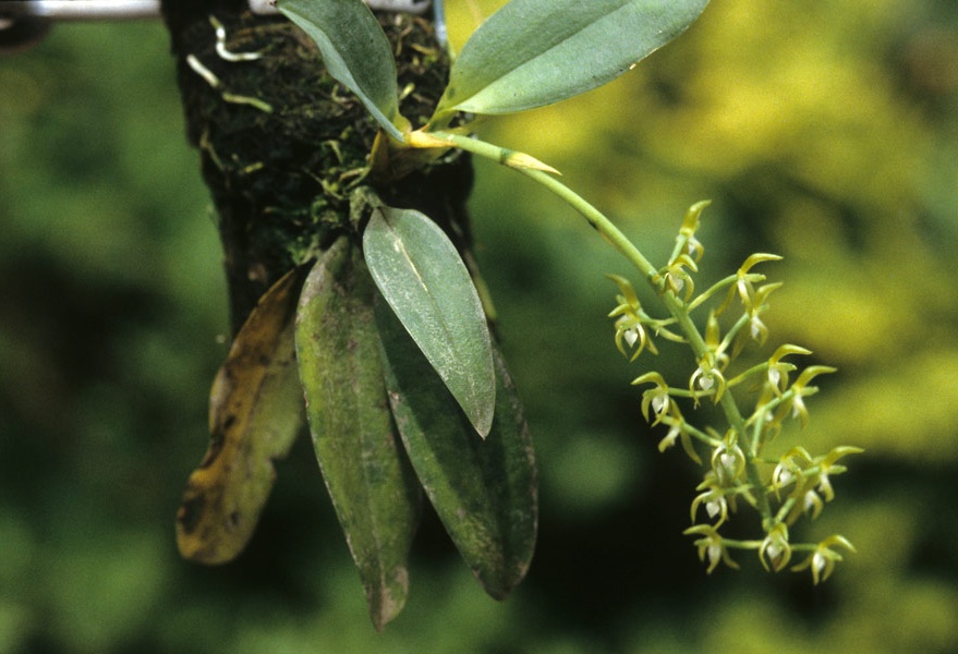 Found in Peru and Bolivia in tropical wet forests at elevations around 240 to 320 meters as a mini-miniature sized, hot growing epiphyte with cylindrical, flattened pseudobulbs enveloped basally by distichous, foliaceous sheaths and carrying subcoriaceous, subrectangular, green elliptic-oblong, obtuse, gradually narrowing below into the conduplicate base leaves that blooms in the summer through winter on a basal, pendent, racemose, to 12" [30 cm] long, many flowered inflorescence