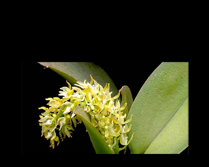 Found in Mexico, Guatemala and El Salvador at elevations of 180 to 1400 meters as a mini-miniature sized, hot to cool growing epiphyte with an oval to elliptic, laterally compressed, rather ancipitous edged, longitudinally rugose to grooved pseudobulb partially enveloped below by several, triangular, conduplicate sheaths with the uppermost being leaf-bearing and and carrying a single, apical, erect, thick, rigid, leathery, conspicuously wrinkled and channeled above along the midvein, prominently keeled below, apically rounded, narrowing below into the petiolate-like base leaf that blooms in the spring on an erect to arching, to 12" [30 cm] long, closely spaced, cylindrical, many flowered, racemose inflorescence ,