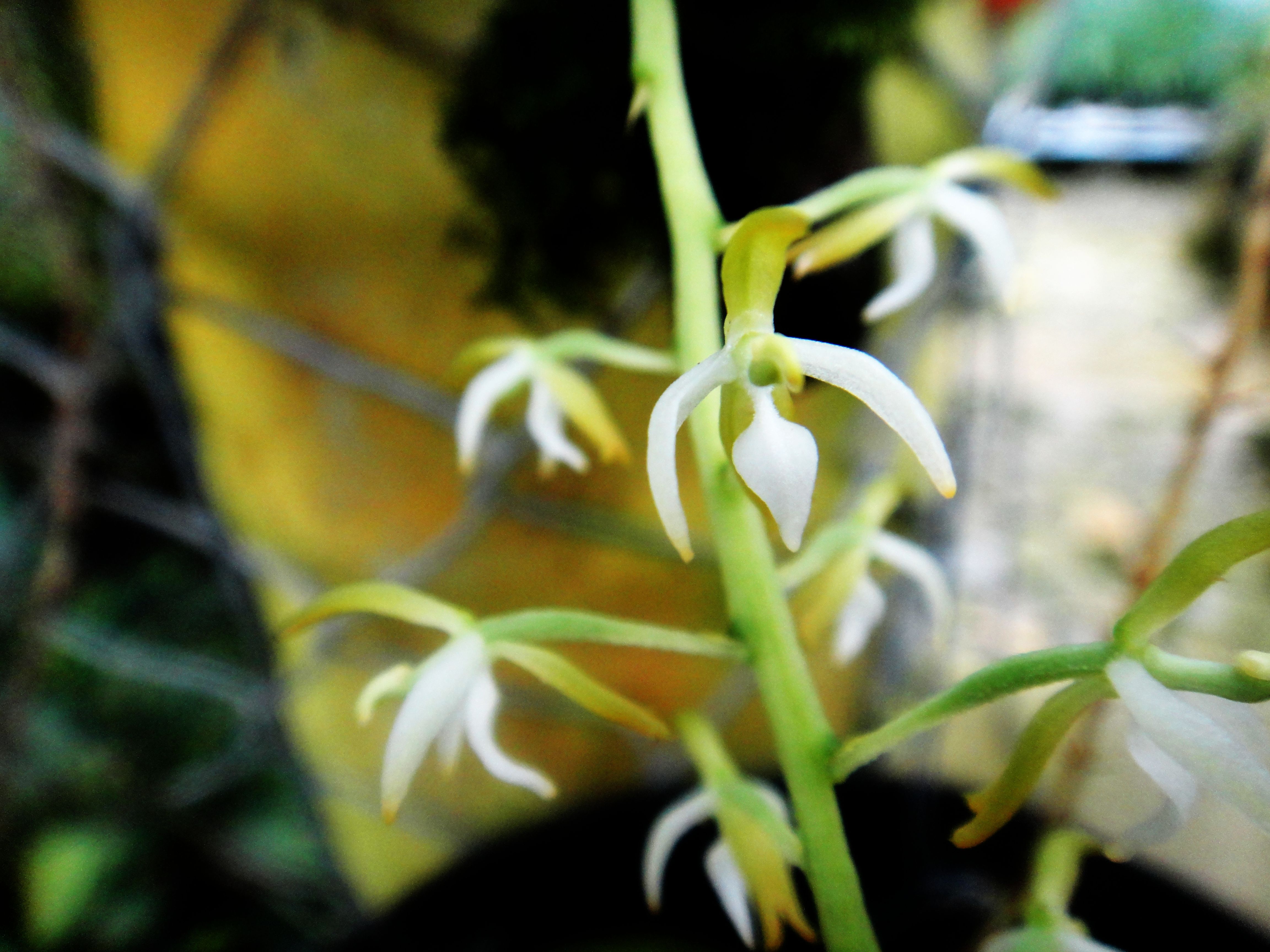 Found in Venezuela, Guyana, Peru and northern Brazil at elevations of 100 to 250 meters as a mini-miniature sized, hot growing epiphyte with small, narrow, compressed pseudobulbs carrying a single, apical, erect, light green, somewhat fleshy, soft, linear, acute, gradually narrowing below into the shortly conduplicate base leaf that blooms in the spring on a pendent, 4" [10 cm] long, moderately compressed, several to many flowered inflorescence