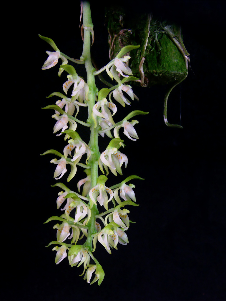 Found in Chiapas Mexico, Guatemala, El Salvador, Honduras, Nicaragua and Costa Rica at elevations of 20 to 1000 meters as a miniature to just small sized, hot to warm growing epiphyte with ovoid pseudobulbs enveloped almost completely by leaf bearing sheaths and carrying a single, apical, erect, somewhat fleshy, abaxially carinate, elliptic to ovate-lanceolate, obtuse, subpetiolate base leaf that blooms in the winter through spring on a pendant, racemose, 4.8 to 10" [12 to 25 cm] long, many flowered inflorescence carrying successively opening flowers
