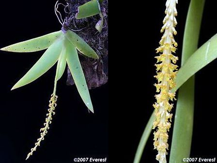 Found in Bangladesh, the western Himalayas, India, the eastern Himalayas, Nepal, Yunnan province of China, Thailand, Laos, Vietnam and Malaysia in forests or thickets at elevations of 600 to 2500 meters as a mini-miniature sized, warm to cold growing epiphyte with 4 to 5, imbricating, ensiform, weakly falcate, acute, fleshy, sessile leaves that blooms in the later summer and earlier fall on a terminal, subdensely many flowered inflroescence completely enveloped by scarious bracts and has scarious, lanceolate, acute to acuminate floral bracts.