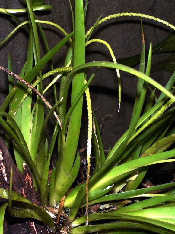 Found in western Sumatra at elevations around 150 meters as a miniature to small sized, hot growing epiphyte with close set elongate stems enveloped by imbricating leaf sheath bases carryiing 10 to 21, long triangular, acute, curving inwards leaves that blooms on an erect, terminal, angular, papillose, 8 to 8.8" [20 to 22 cm] long, laxly many flowered inflorescence with oblong, narrowing apically, irregularily dentate floral bracts and carrying whorls of 5 to6 flowers.