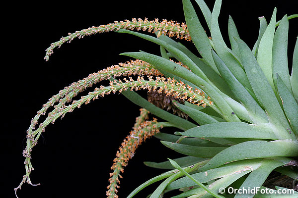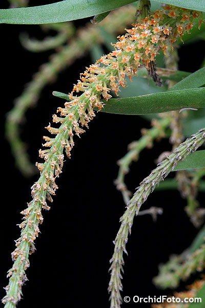 Found in Thailand and China at elevations around 1400 meters as a mini-miniature sized, cool growing epiphyte with narrow, non-jointed leaves held in a loose fan, that blooms in the fall and winter on an axillary, 7.2" [18 cm] long overall, rachis 1.2 to 1.6" [3 to 4 cm] long, many flowered inflorescence with triangular, irregularily dented, much shorter than the ovary floral bracts and holding the flowers in close, somewhat irregular, 8 flowered whorls, becoming looser towards the apex.