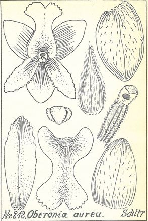 Oberonia aurea Schltr. 1905SUBGENUS Menophyllum SECTION Adenorhachis Schlechter Type Drawing by © Schlechter and The Swiss Orchid Foundation at the Jany Renz Herbaria Website