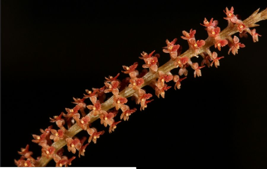 Found in Queensland Australia on sheltered rocky slopes, open forest, scrub, mangroves and rainforest as a mini-miniature sized, hot to warm growing epiphyte or lithophyte with a stem enveloped by imbricating leaf sheath bases carrying 4 t o6, green to reddish, fleshy, acute leaves that blooms in the summer and fall on a terminal, arching to pendulous, 2 to 6" [5 to 15 cm] long, many flowered inflorescence with towards the base whorls of bristle like bracts and carrying whorls of 8 to 10 flowers.