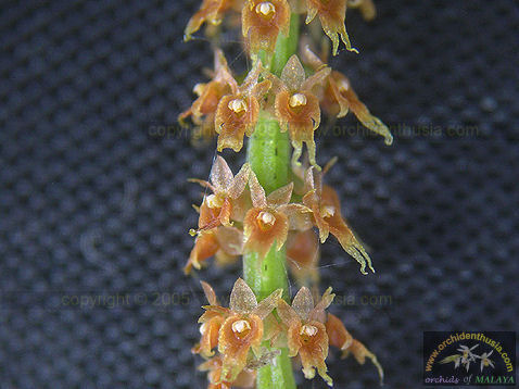 Found in the Yunnan province of China, eastern Himalayas, Nepal, Thailand, Vietnam, Malaysia and Sumatra in tropical valleys at elevations of 1300 to 1800 meters as a mini-miniature to small sized, cool growing epiphyte with a flexuose stem enveloped completely by imbricating leaf-bearing sheaths carrying 5 to 6, linear-ensiform, falcate leaves that blooms in the summer and early fall on an erect, subverticillate, terete, 1.6 to 6.4" [4 to 16 cm] long, densely many flowered inflorescence with lanceolate, acute, hyaline, erose floral bracts.