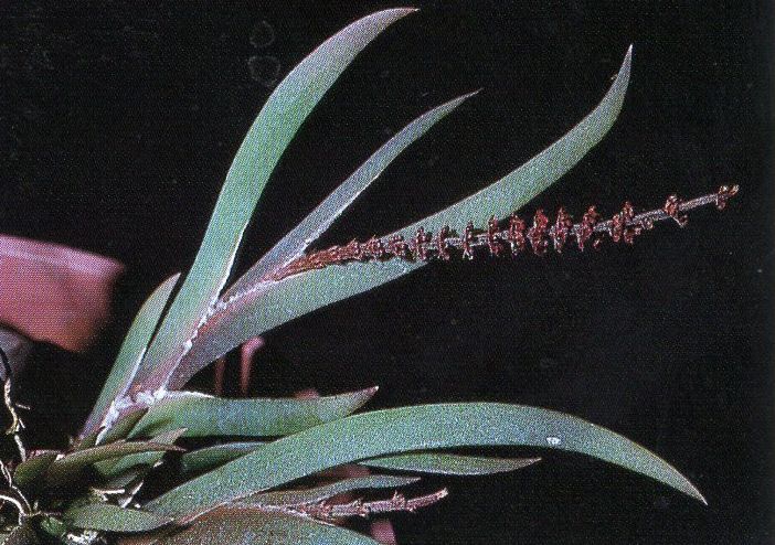 Found in New Guinea at elevations around 1200 meters as a miniature sized, cool growing epiphyte with a very short rhizome giving rise to very short, erect, densely leafy stem carrying 4 to 6, erect-patent, obliquely subfalcate, lanceolate-ligulate, acute to subacuminate, glabrous leaves that blooms in the winter on a somewhat curved, to 1.4" [3.5 cm] long, laxly to 15 flowered inflorescence with lanceolate, acute, glabrous, subdentate margin, equal to the ovary floral bracts.