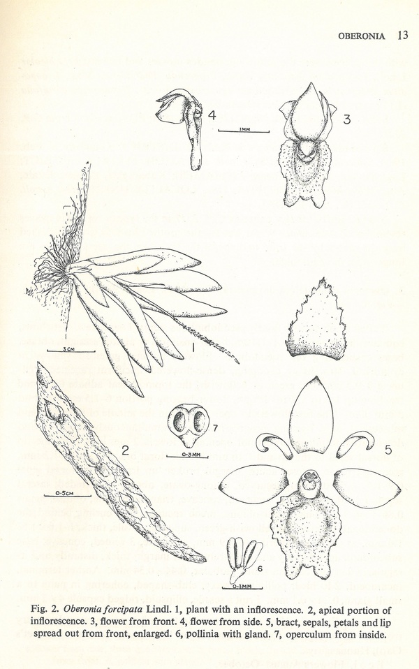 Oberonia forcipata Lindl. 1859 Drawing by © M.D.Dassanayake & F.R.Fosberg and The Swiss Orchid Foundation at the Jany Renz Herbaria Website