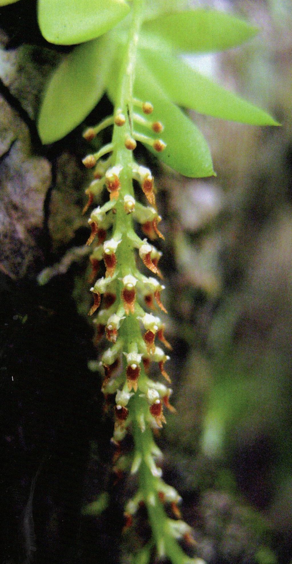 Found in Yunnan province of China, Myanmar and Thailand at elevations around 560 to 1200 meters as a mini-miniature sized, warm to cool growing epiphyte with a very sort stem carrying, linear-lanceolate, tapering towards the apex, acute leaves that blooms in the late summer and earlier fall on a terminal, erect, to 1.6 to 6" [4 to 15 cm] long, laxly many flowered inflorescence with insignificanr, entire, as long as the ovary floral bracts carrying flowers in whorls of 4 to 7 flowers with very light greenish to orange-yellow tepals and a light brown to brownish-purple lip.