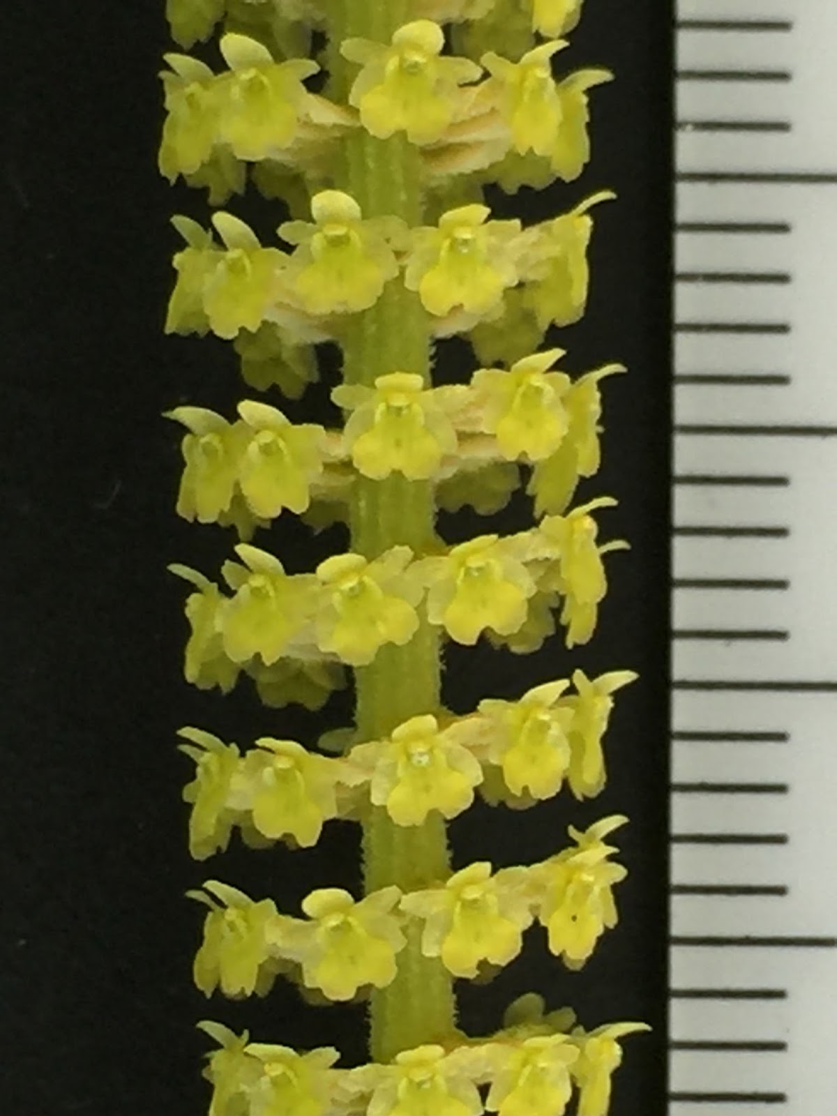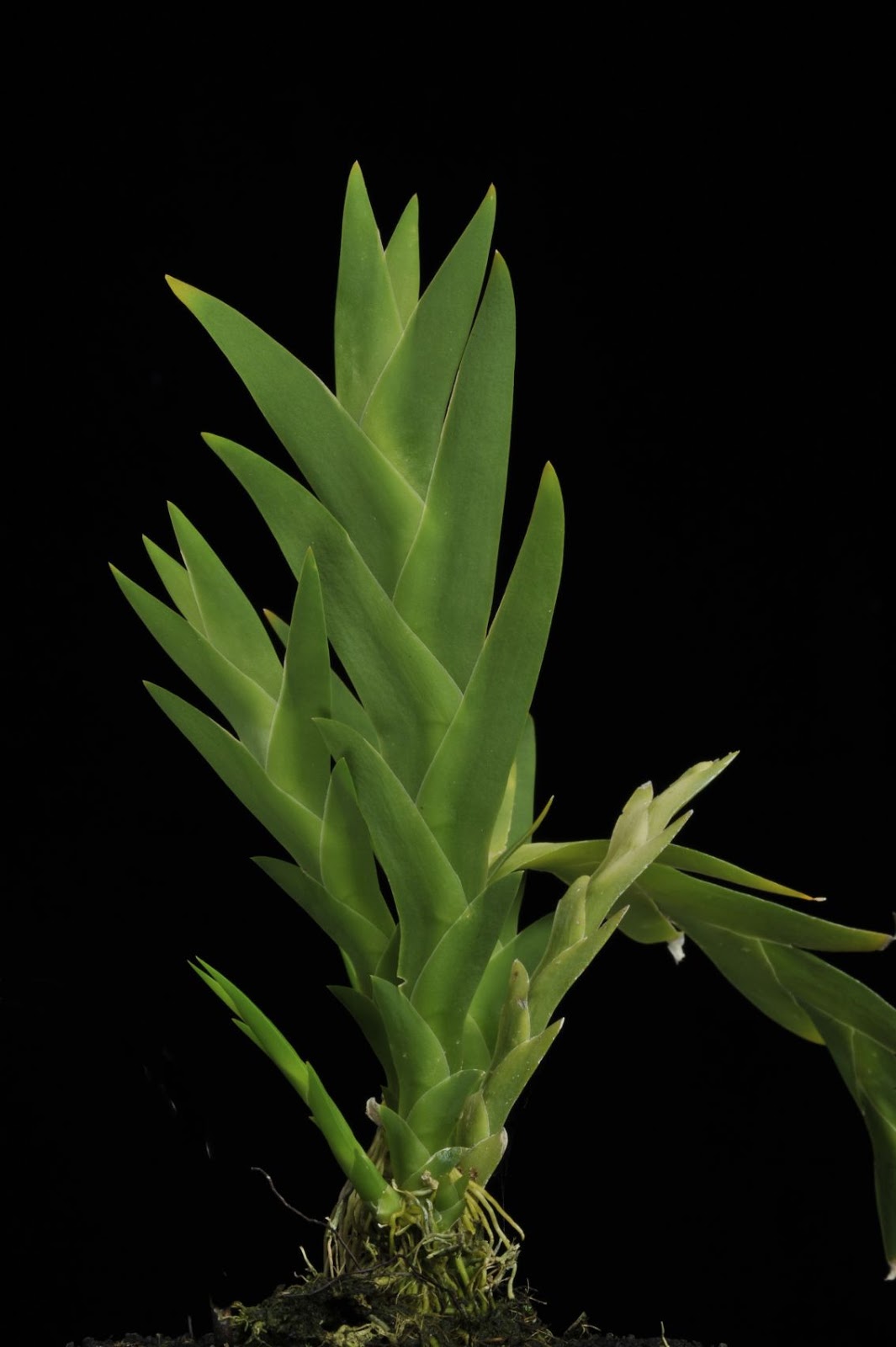 Found in the Philippines at elevations of 800 to 1300 meters as a mini-miniature sized, warm to cool growing epiphyte with an erect to semipendent stem carrying sword-shaped, fleshy, slightly curved, overlapping and 2 ranked leaves that blooms on a terminal, slender, to 4" [10 cm] long, densely many flowered inflorescence with linear to lanceolate, equal in length to the ovary floral bracts.