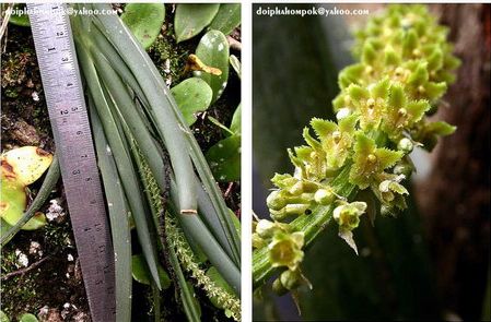 Found in Yunnan province of China, Thailand and Vietnam at elevations of 1500 to 2100 meters as a small sized, cool to cold growing epiphyte with a short stem carrying several, equitant, linear, oval in cross section, acute leaves that blooms in the later spring and early summer on a pendant, to 6" [15 cm] long, cylindrical, densely many flowered inflorescence
