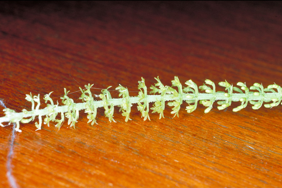 Found in New Guinea, the Bismark Archipelago and the Solomon Islands at elevations around 1000 meters as a laxly pendent, medium sized, warm to cool growing epiphyte with pendent, slightly zigzag stems enveloped completely by imbricating leaf sheath bases carrying distichous, 2 to 8, linear, incurved apically leaves that blooms in the early summer on a terminal, to 5.6" [14 cm] long, densely many flowered inflorescence with lanceolate, serrate margined, finely pubescent on the outside floral bracts and carrying nonresupinate flowers in whorls.