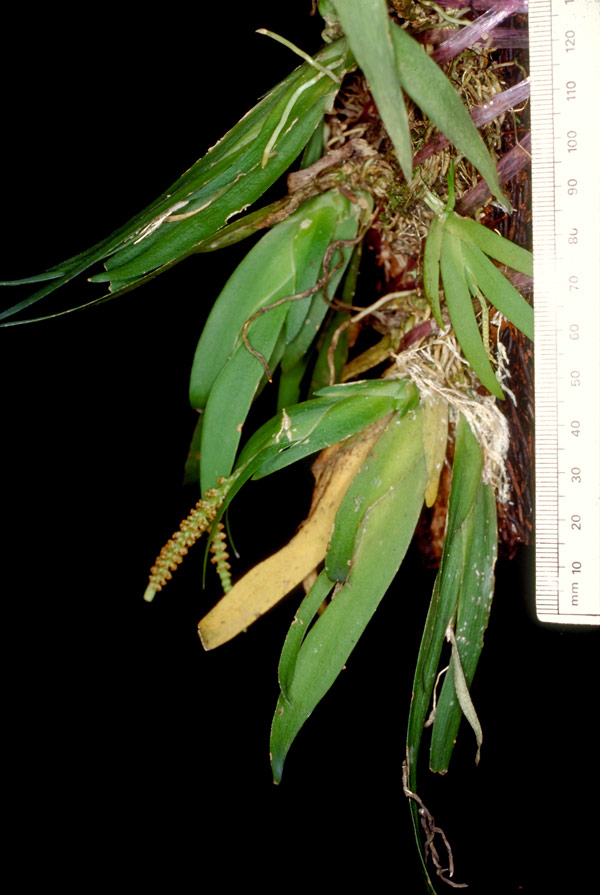 Found in Malaysia, Sumatra and Java in wetter montane forests at elevations of 600 to 1800 meters as a mini- miniature sized, warm to cool growing epiphyte with a short stem carrying 3 to 4, spread out, linear, gradually narrowing to the acute apex leaves that blooms in the summer on an axillary, to 5" [12.5 cm] long, several flowered inflorescence
