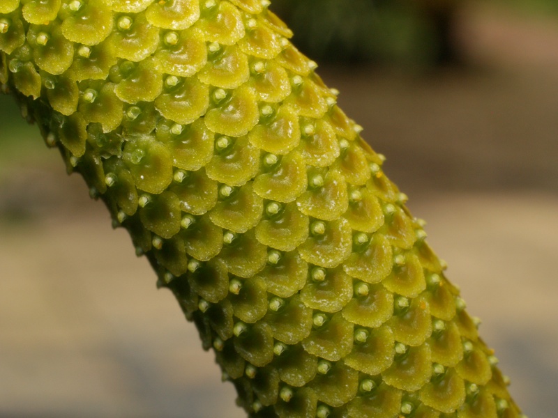 Found in the eastern Himalayas, Assam, Bhutan, Myanmar and Thailand at eleavations 700 to 1300 meters as a medium sized, cool growing epiphyte with broadly linear, acute, conduplicate leaves that blooms in the late spring and summer on an erect then arching, terminal, peduncle ebracteate, fleshy, cylindrical, fat, to 10" [25 cm] long overall, rachis 5.6 to 6.8" [14 to 17 cm] long, densely many flowered inflorescence with longer than the ovary, oblong, acute floral bracts