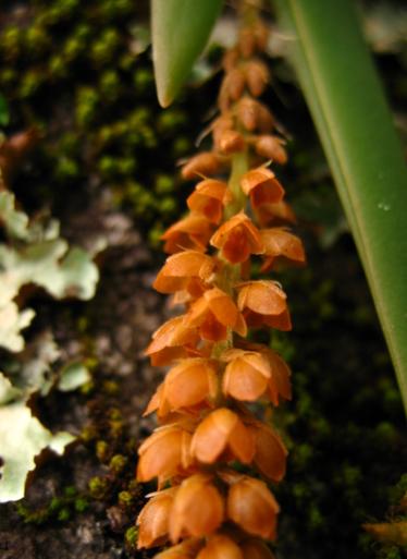 Found in south Yunnan Province of China in mixed forests at elevations aound 1800 meters as a mini-miniature sized, cool growing epiphyte with a conspicuous stem carrying 3 to 4, distichous-equitant, laterally compressed, subensiform, often slightly falcate, thickened, not articulate basally, acuminate t oobtuse apically leaves that blooms in the early summer on an axillary, 1 to 3" [2.5 to 7.5 cm] long, densely many flowered inflorescence with a few sterile, lanceoalte bracts and linear-lanceoalte, nearly entire margin, long acuminate apcailly floral bracts.