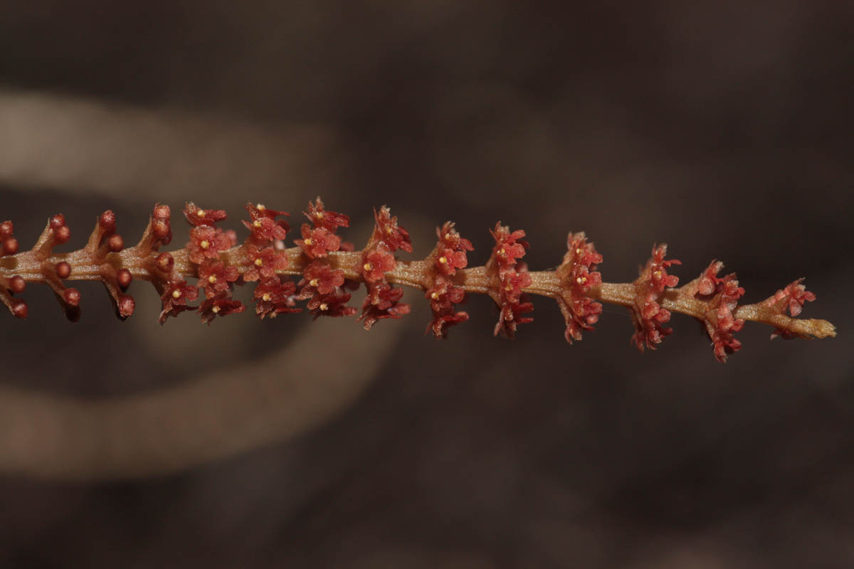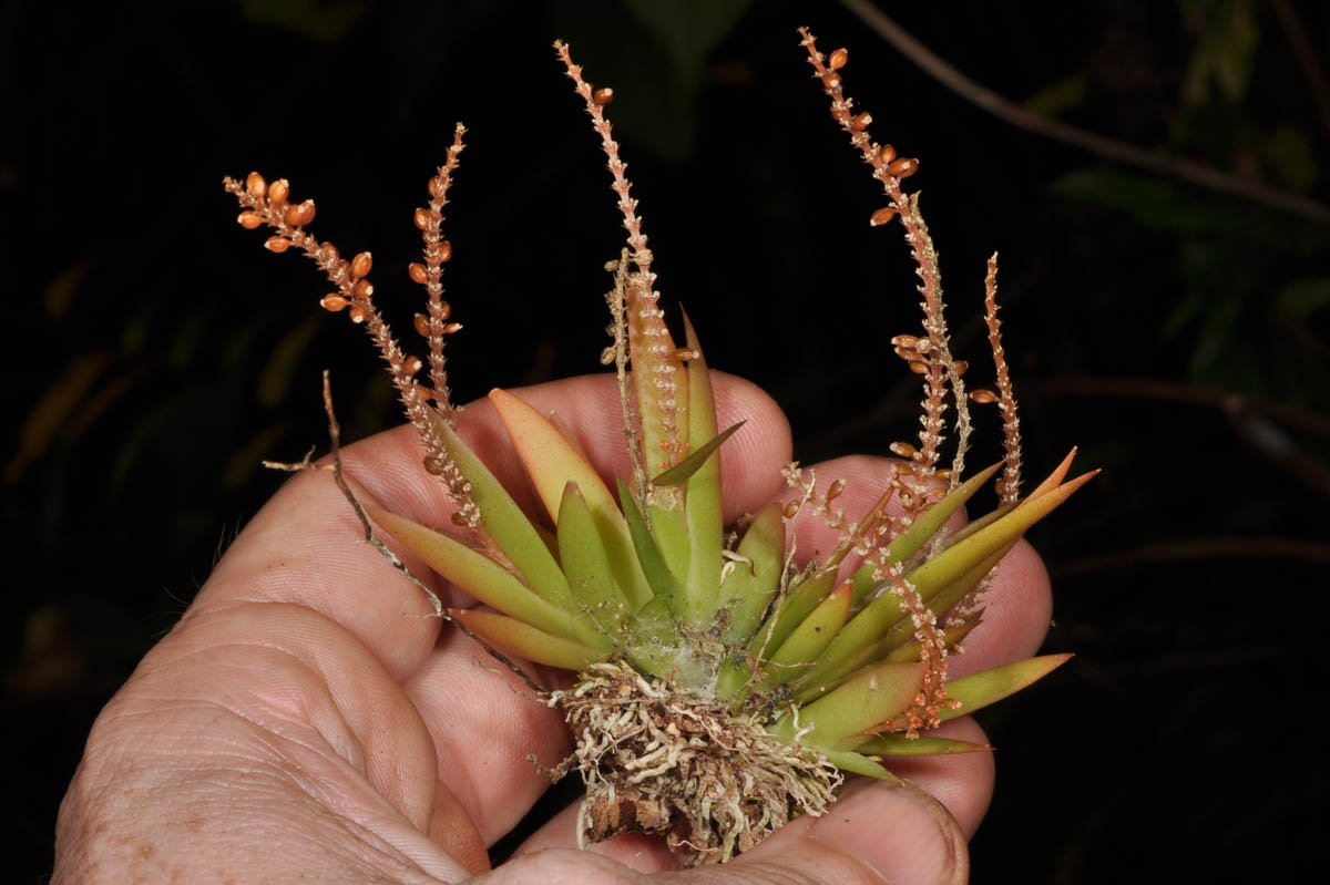 Found in the Philippines on twigs and small branches at elevations up to 500 meters as a mini-miniature sized, hot , semipendulous to pendent growing epiphyte with imbricating leaf sheath bases carrying fleshy, pointed leaves that blooms in the fall and winter on an pendulous, terminal, to 4.8" [12 cm] long, many flowered inflorescence with sharply triangular floral bracts and carrying flowers arranged in whorls.