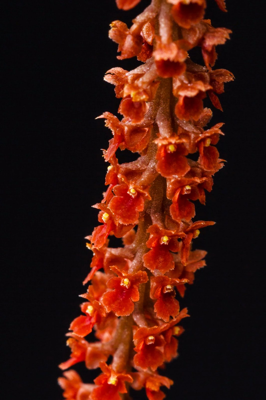 Found in Thailand, Malaysia, Java, Vietnam and Taiwan in evergreen forests along streams in very wet forests at elevations of 250 to 1250 meters as a mini-miniature sized, hot to cool growing epiphyte with thin stems enveloped completely by imbricate leaf sheath bases carrying 5 or so, different sized, rather narrow, scarsely diverging from one another and curving inward, distichous-equitant, laterally compressed, acuminate to slightly curve-tipped leaves that blooms in the spring on an axillary, to 4" [10 cm] long, many flowered inflorescence with oblong floral bracts and [2 to 3 mm] between each whorl of flowers .