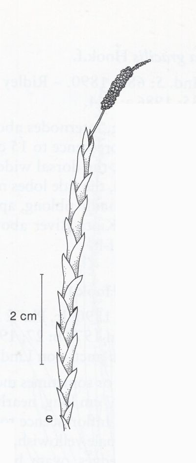 Found in Sarawak Borneo as a small sized epiphyte very oblique, narrowly acute apices, set close to the stem leaves that blooms on an erect, to 3.2" [8 cm] long, many inflorescence carrying red, close set near the base , more distant towards the apex.
