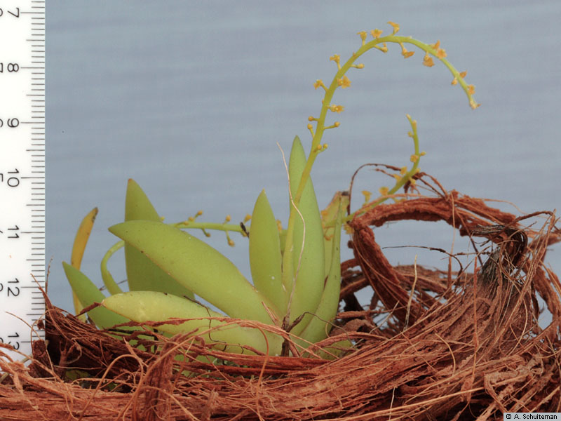 Found in Bangladesh, India, Myanmar, Thailand, Laos, southern Yunnan and Hainan Island China as well as Vietnam in forests on trees or on rocks at elevations of 500 to 900 meters as a miniature sized, warm growing epiphyte or lithophyte with a fan-shaped array of, several, distichous, conduplicate, curved, acute, equitant leaves that blooms in the summer on an erect to arching, terminal, basally narrowly winged, peduncle 4 to 11.2" [10 to 28 cm] long, rachis 2.8 to 7.2" [7 to 18 cm] long, laxly many [20] flowered inflorescence with several to many very small sterile bracts and sub-oblong-ovate, irregularily erose to dentate margined floral bracts.