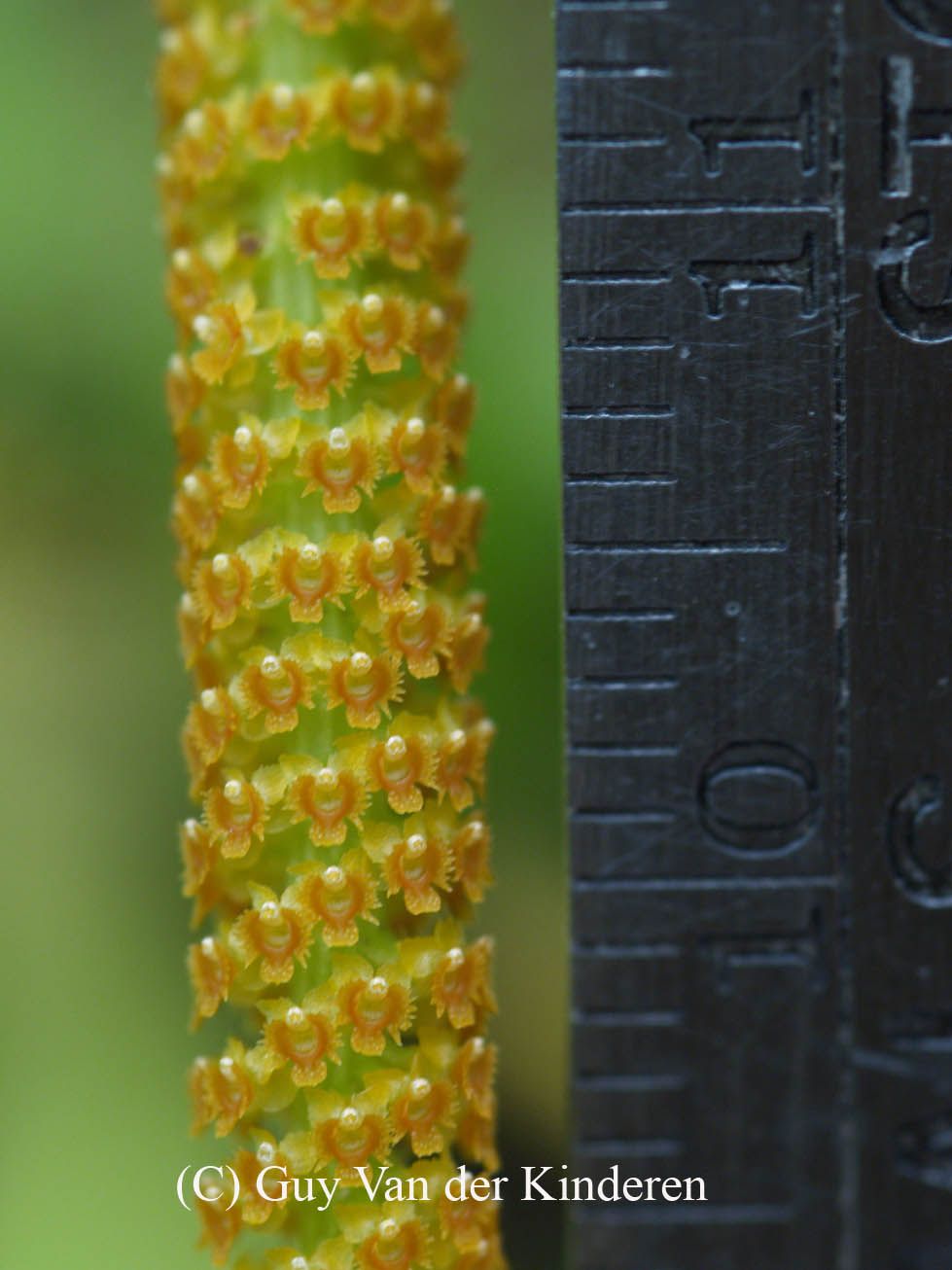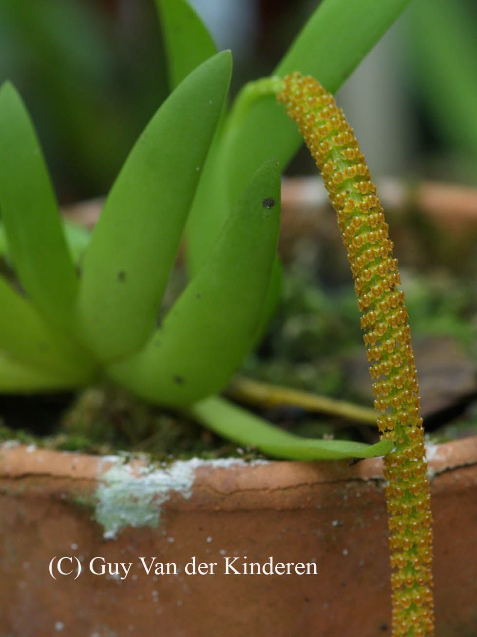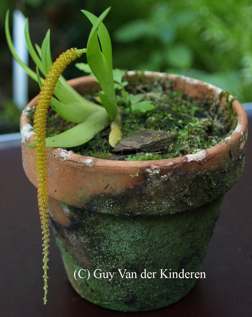 Found in Assam, the eastern Himalayas, Nepal, Myanmar, Thailand and southern China on trees in forests at elevations of 400 to 1300 meters as a mini-miniature sized, hot to cool growing epiphtye with a short stem carrying 4 to 5, linear-ensiform, acute to subacute, leaves in a fan shape that blooms in the fall on a decurved, verticillate, 4" [10 cm] long, densely many flowered inflorescence with filiform, subsimilar, reflexed floral bracts