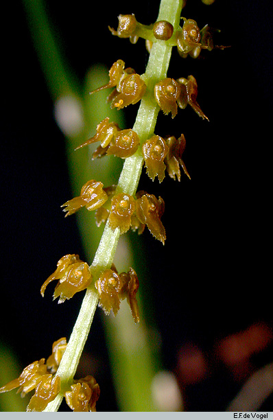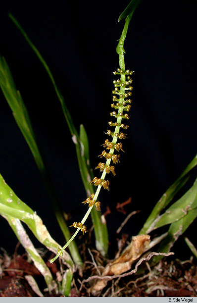 Found in the Moluccas in lowland forests at elevations of 85 to 450 meters as a miniature to small sized, hot growing epiphyte with pendant, 8 to 12" [20 to 30 cm] long, clustered, elongate, flexuous, glabrous stems enveloped almost copmpletely by many erect, patent, imbricate, lanceolate, acute, leaves that blooms in the spring on an erect then arching, elongated, cylindrical, 2.4" [6 cm] long, racemose inflorescence with patent, ovate-lanceolate, acute, glabrous, shorter than the ovary floral bracts and carrying minute, non-resupinate flowers.