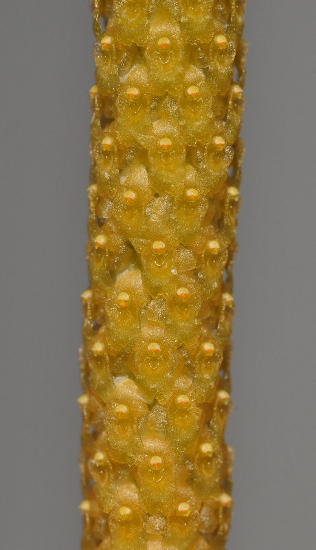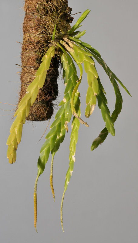 Found in Cambodia, Myanmar, Thailand, Vietnam, Borneo, Java, Malaysia, Moluccas, the Philippines, and Sumatra in semi-open lowland areas at elevations of sealevel to 150 meters as a small sized, hot growing epiphyte with a pendant stem enveloped completely by small, flattened, imbricating, conduplicate, oblique, blunt apically leaves that blooms in the fall on a terminal, sessile, to 3.4" [8.5 cm] long, densely many flowered inflorescence