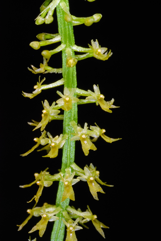 Found in tha Chinese Himalayas, Assam, Darjeeling, Sikkim, India and Sri Lanka in tropical valleys and in submontane and tropical wet evergreen forests elevations of 900 to 2000 meters as a mini-miniature sized, warm to cool growing epiphyte with a fan of 3 to 4, ensiform-lanceolate, tapering to an acute apex, straight to weakly falcate, imbricate basally leavest that blooms in the fall and winter on an erect to decurved, 1.2 to 2.4" [3 to 6 cm] long, densely many flowered, terete, grooved inflorescence with oblong-lanceolate to elliptic, subacute, crenulate to entire floral bracts