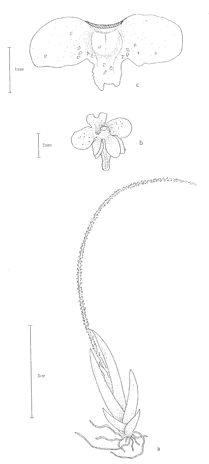 Found in southern India at eleavtions of 1500 to 2500 meters as a mini-miniature sized, cool to cold, pendulous growing epiphyte with out a stem with basally articulate, ensiform, acute to subacuminate leaves that blooms in the spring on a terminal, erect, peduncle to 4" [10 cm] long, rachis to 12" [30 cm] long, flattened and adnate to the reduced uppermost leaf, pendulous, many flowered inflorescence with ovate, acuminate, iregularilly denticulate margins, longer than the ovary floral bracts and carrying subverticillate yellow flowers
