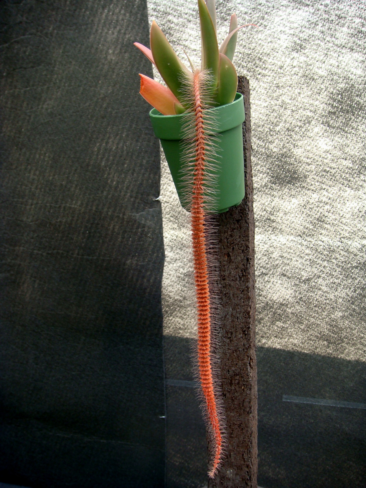 Found in the Philippines at elevations of 75 to 2000 meters as a miniature sized, hot to cool growing epiphyte with thick, imbricate leaves held in a fan and blooms in the spring, summer and fallon a pendant, 12" [30 cm] long, many flowered inflorescence.