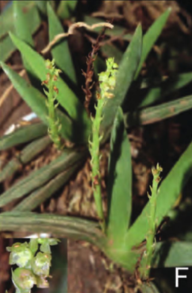 Found in southern Vietnam in primary and old broad-leaved evergreen humid, submontane forests at elevations of 950 to 1000 meters as a mini-miniature sized, warm growing epiphyte with an abbreviate stem enveloped completely by 3 to 7, imbricate, equitant, distichous, articulate basally, fleshy, subterete, laterally compressed, ensiform, oblong-lanceolate to broadly lanceolate, mostly broadest at the abse, narrowing towards the triangular-acute apex leaves that blooms in the fall on a lateral, arising from a leaf axil, almost straight to slightly curved, smoewhat secund, light green, peduncle indistinctly longitudinally ribbed, stout, erect, .08 to .2" [2 to 5 mm] long, naked or with 1 to 2 small rtiangular sterile bracts, rachis straight, .08 to .2" [2 to 5 mm] long, 4 to 18 flowered inflorescence with triangular, acuminate, single veined, light green to almost white becoming dull yellowish, membraneous flral bracts and carrying resupinate, subsessile, campanulate flowers that do not open well.